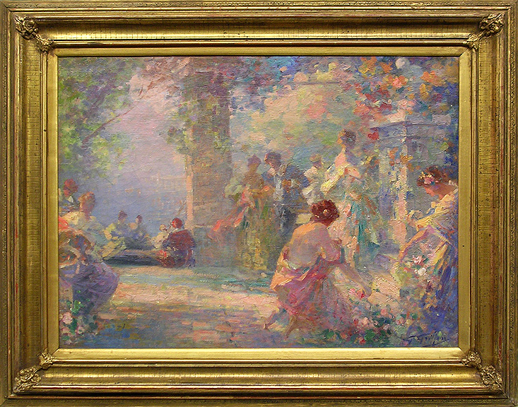 Original oil on canvas. Hand signed by the artist in blue paint lower right. Dimensions: 21 1/4" x 28 3/4"; Framed: 28 3/4" x 36 3/8" Griffon was born in Toulouse, a town in Southwest France. He is best known for allegorical and genre paintings; his garden scenes and his ‘fêtes galantes’ remind one of the 18th century works of Watteau, but interpreted in a post impressionist, fluid and ethereal manner. His palette is clear and fresh and his brushwork is subtle yet assured. Today, his work is in collections in Paris, London, New York, Boston and Geneva. |