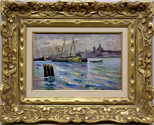 Original oil on board. Hand signed by the artist in brown paint, lower right. Dimensions: unframed: 20" x 11 5/8", framed: 15 1/2" x 19 1/4" Born in Milan, Santagostino was a well-known Italian industrialist and a self-taught artist who passionately dedicated himself to painting. He exhibited his work for the first time in an art exhibition in San Remo where he received a silver medal. He regularly entered his work in exhibitions in Milan and starting in 1928, in the Salone Della Permanente in Rome. The majority of Santagostino's paintings are held by his direct descendants, but some are in private collections. The Modern Art Museum of Milan possesses several of his landscapes. (A. M. Comanducci, Dizionrio illustrato dei Pittori, Disegnatori, e incisori Italiani Moderni e Contemporanei, Vol 5) |