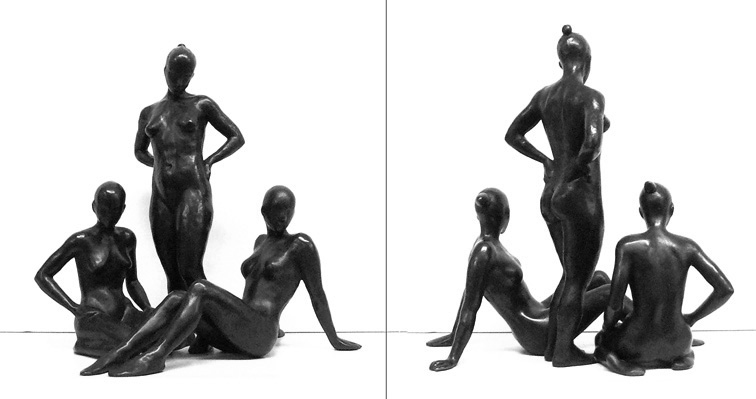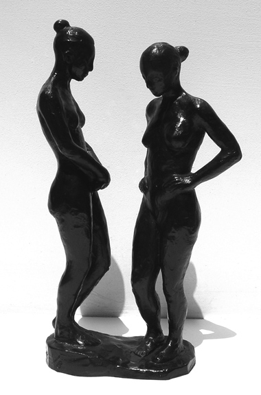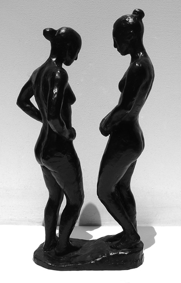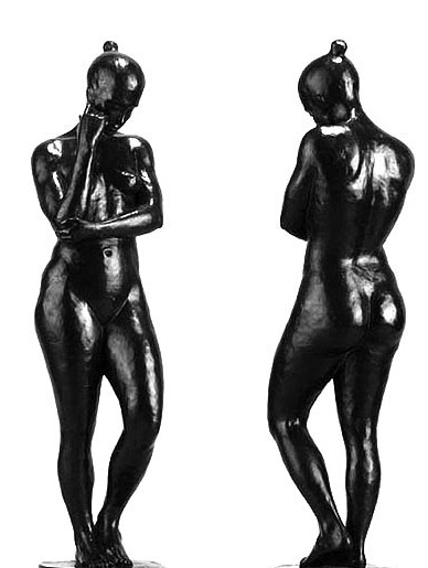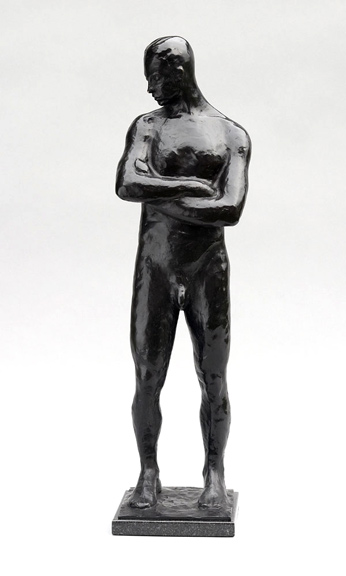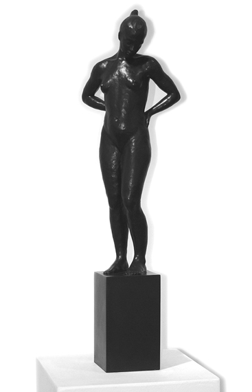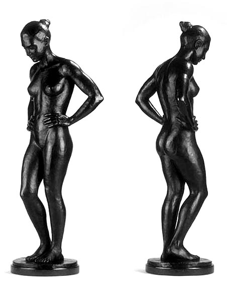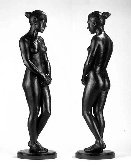 Original bronze sculpture from the edition of 12. Signature, date and edition number incised on the base. Dimensions: H: 36" x W: 15 1/4" x D: 10 1/4" Jeffrey Van Dyke was born in Shasta County, California in 1959. He began sculpting in his twenties while completing graduate studies in structural engineering. He began exhibiting in 2001, following seventeen years of self-directed study in the history, materials, and techniques of sculpture. His strongest influences are 16 th Century Italian, 20 th Century French and contemporary Mexican artists. "By modeling the undraped figure in a realistic style, free of props... and by eliminating color and avoiding a refined finish, I attempt to play down the surface and thus emphasize the human essence." These original sculptures are first modeled in wax with an internal steel armature. They are then cast in silicon bronze with a black patina and black granite base.