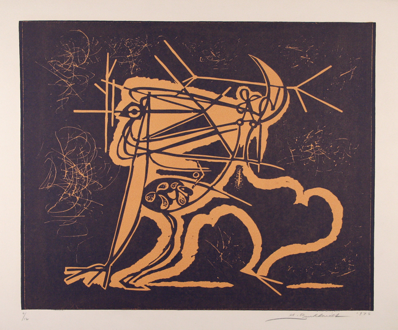 Original linocut on Arches wove paper. Hand signed and dated by the artist in pencil, "H. Burkardt, 1976," lower right. Numbered "4/12" in pencil, lower left. In excellent condition. Image size: 15" x 18", sheet size: 22" x 30"