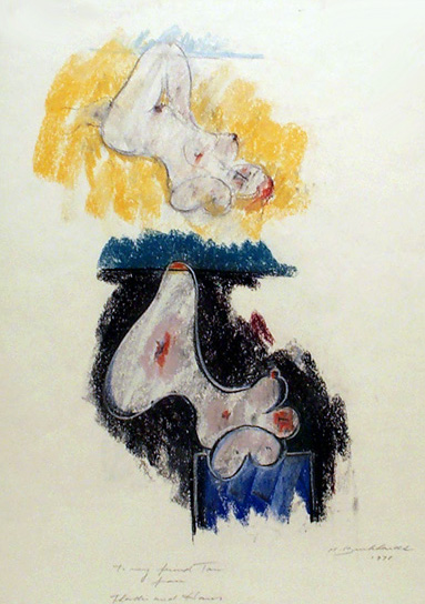 Original pastel drawing on paper. Hand signed and dated by the artist, "H. Burkhardt 1978", lower right. Dedicated lower left, "To my friend Tom from Thordis and Hans." In excellent condition.