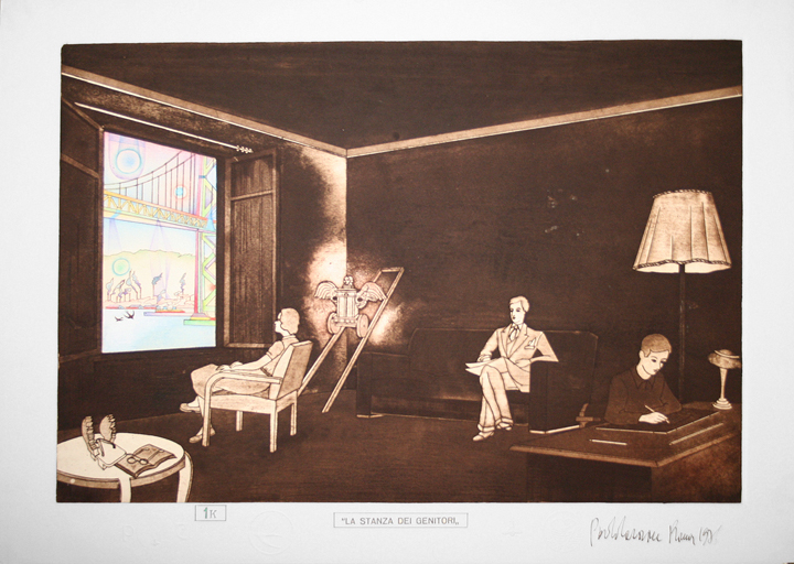 Original etching and aquatint with hand coloring on Fabriano wove paper, with four of the artist’s blindstamps in the lower margin: “Paolo Carosone, Roma, 1976”. A unique impression from a varied edition. In very good condition, unframed. Platemark: 16” x 24”; Sheet size: 20” x 28 1/8” |