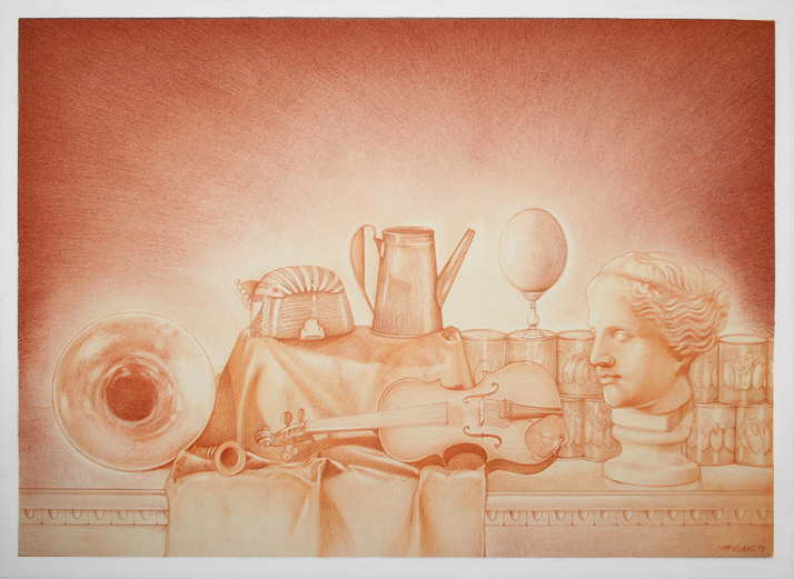Original drawing in burnt-red conté crayon on 100% Fabriano wove paper with deckled edges. Hand signed and dated in red conté crayon lower right: "P. Carosone 89". In very good condition, unframed.