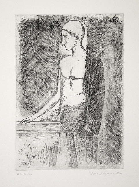 Original etching and drypoint on copperplate paper. Signed in the plate, "C. Carrà" lower left. Inscribed in pencil, "ES. 34/60, Dopo il Bagno 1924" lower margin. An impression from the edition of 60 for the portfolio "Opera grafica di Carrà," aside from the edition of 25 printed in 1924, 2 artist proofs, and a posthumous edition of 70 printed in 1971. Published by De Tullio di Milano, 1971. In excellent condition. In 1899-1900, Carrà was in Paris decorating pavilions at the Exposition Universelle, where he became acquainted with contemporary French art. He then spent a few months in London in contact with exiled Italian anarchists, and returned to Milan in 1901. In 1906, he enrolled at Brera Academy (Accademia di Brera) in the city, and studied under Cesare Tallone. In 1910 he signed, along with Umberto Boccioni, Luigi Russolo, Giacomo Balla, Gino Severini and Filippo Marinetti the Manifesto of Futurist Painters, and began a phase of painting that became his most popular and influential. Carrà's Futurist phase ended around the time World War I began. His work, while still using some Futurist concepts, began to deal more clearly with form and stillness, rather than motion and feeling. Carrà soon began creating still lifes in a style he, along with Giorgio de Chirico, called "metaphysical painting". In the 1920s and 1930s, the metaphysical phase gave way to a much more sombre style, which he perfected throughout his life. He died in Milan in 1966. |