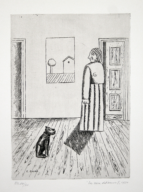 Original etching and drypoint on copperplate paper. Signed in the plate "C. Carrà," lower left. Inscribed in pencil "ES. 34/60, La Casa dell' Amore II 1924" in the lower margins. An impression from the edition of 60 for the portfolio "Opera grafica di Carrà," aside from an edition of 25 printed in 1924, and an edition of 10 printed in 1951. Published by De Tullio di Milano, 1971. In excellent condition, framed with conservation materials. |