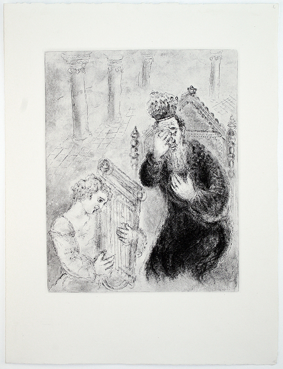 Original etching on wove paper. Signed in the plate, "Chagall," lower right. From the series of 105 etchings from "The Bible" comissioned by Ambroise Vollard. Impression from the edition of 275 aside from an edition of 20 Hors Commerce, and aside from an edition of 100 on Vélin d'Arches paper hand signed, colored and numbered by the artist. Published by Tériade, Paris, 1956.