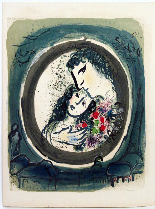 Original lithograph on Arches wove paper from an illustrated folio, which includes 7 original lithographs (3 in color, 4 in gray) and 2 original woodcuts (in black ink). All original graphic works are unsigned and unnumbered, except the color lithograph frontispiece. The frontispiece is hand signed and numbered by the artist in pencil, "Marc Chagall" lower right, and "64/250" lower left. The folio is #64 from an edition of 250, aside from 20 H.C. folios numbered in Roman Numerals. The folio also contains text written by Robert Marteau and several reproductions of Chagall's works executed by Charles Sorlier under the artist's direction. The text was printed by Imprimerie Nationale, Paris. The original lithographs were printed by Fernand Mourlot. The orginal woodcuts were printed at Atelier Lacourière et Frélaut, Paris. The entire folio was published by Mourlot, Paris in 1976.