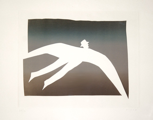 Original etching and aquatint in colors on wove paper with full margins. Hand signed "Folon" in pencil, lower right, and numbered: "44/90" at lower left.