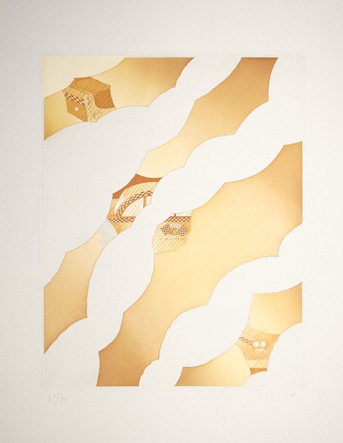 Original color aquatint on wove paper with full margins.  Hand signed and dated in blue colored pencil, lower margin.  A "Bon a Tirer" impression from the portfolio of 4 aquatints titled: "Jeux de Main".