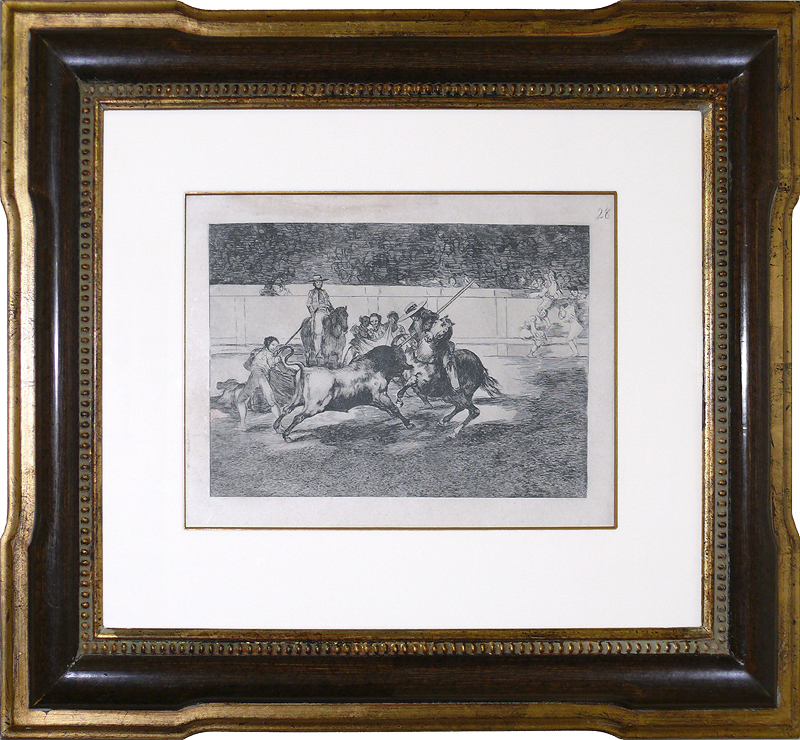 Original etching, burnished aquatint and burin printed on laid paper with the Serra watermark, full margins and deckled edges. Signed in the plate, lower right corner: "Goya." Plate 28 from the series of 33 etchings and aquatint entitled LA TAUROMAQUIA, numbered in the plate upper right. An impression of the first edition, in very good condition, framed with museum quality conservation materials. Sheet size: 12 1/2" x 17 1/4"; Framed: 22 1/8" x 26" |