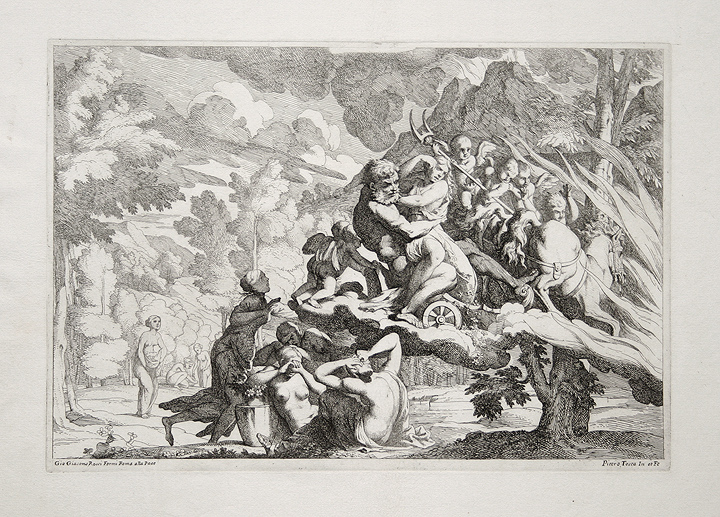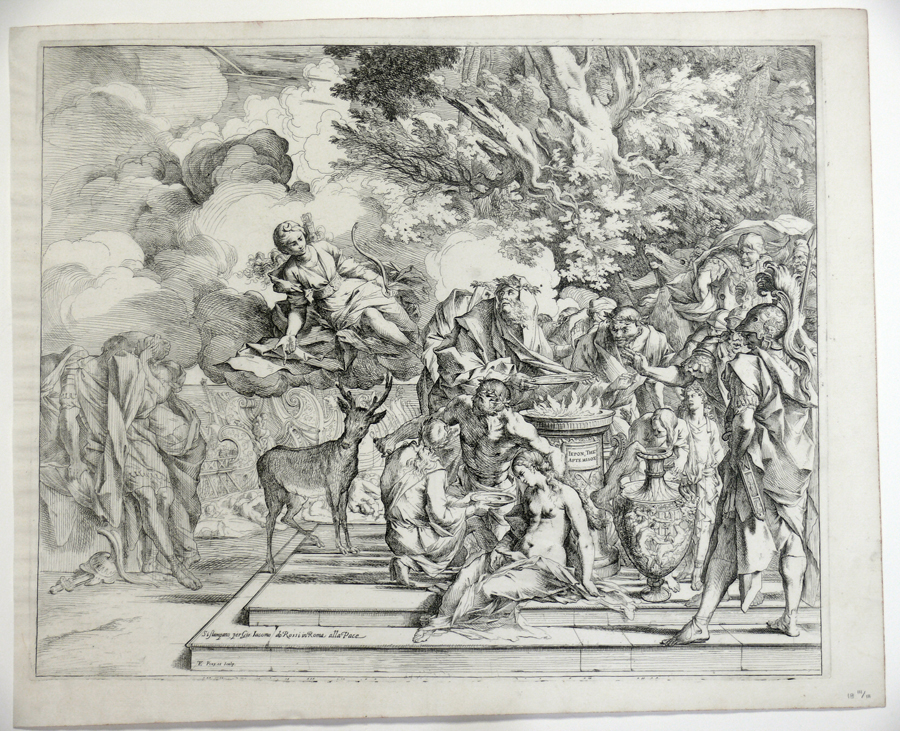 Original etching on laid paper with watermark of fleur-de-lys in a circle surrounded by a crown. Signed in the plate: "Petrus Testa inventor" indicates that Pietro prepared the compostion and Giovanni Cesare executed the etching. Name of publisher inscribed in the plate, lower left margin: "Gio: Iacomo de Rossi formis Romae alla Pace". In very good condition, currently unframed.